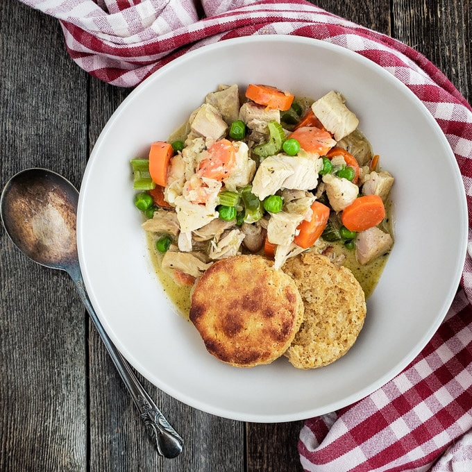 Skillet | Roasted turkey (or chicken) simmered in a light, creamy sauce with traditional pot pie vegetables is at the top of our comfort food list!
